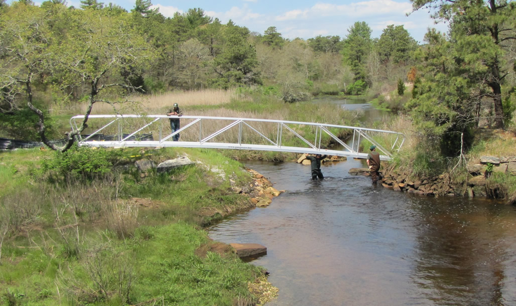 | The trail bridge had to be hand carried down a trail to its present location on the Red Brook. |
