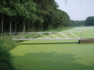 This 40' x 3' aluminum gangway is located at a sewage treatment plant in Concorde, Georgia. It allows for easy water sampling in the plants lagoon.